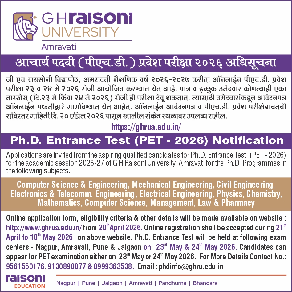 ADMISSION FOR Ph.D. ENTRANCE TEST, GHRU PET 2026